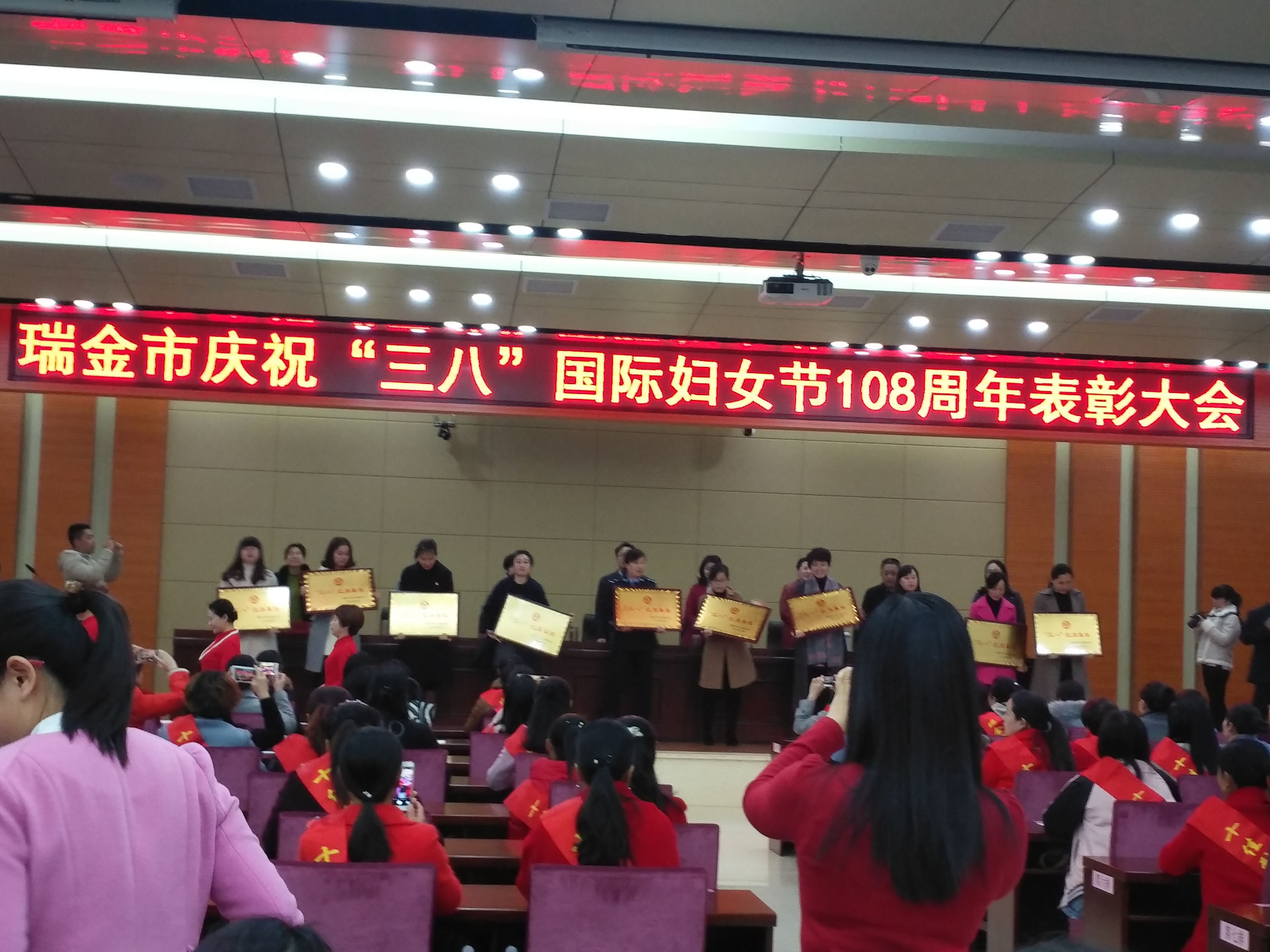 3月8日上午,我馆多名妇女干部和受表彰的女职工参加瑞金市妇联举办的“三八”妇女节表彰大会,我馆红井旧址管理处被评为“三八红旗集体”,谢丽评为“十佳敬老孝老好女儿”。会上副市长谢江溪作了重要发言,表彰了一大批先进妇女,肯定了我们女同志在工作和家庭取得了真正的半边天的作用。