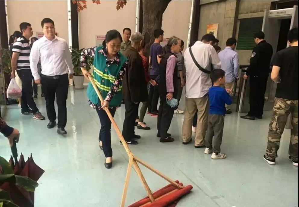陈列馆保洁员清洁大厅雨水、泥巴,确保地面干净整洁