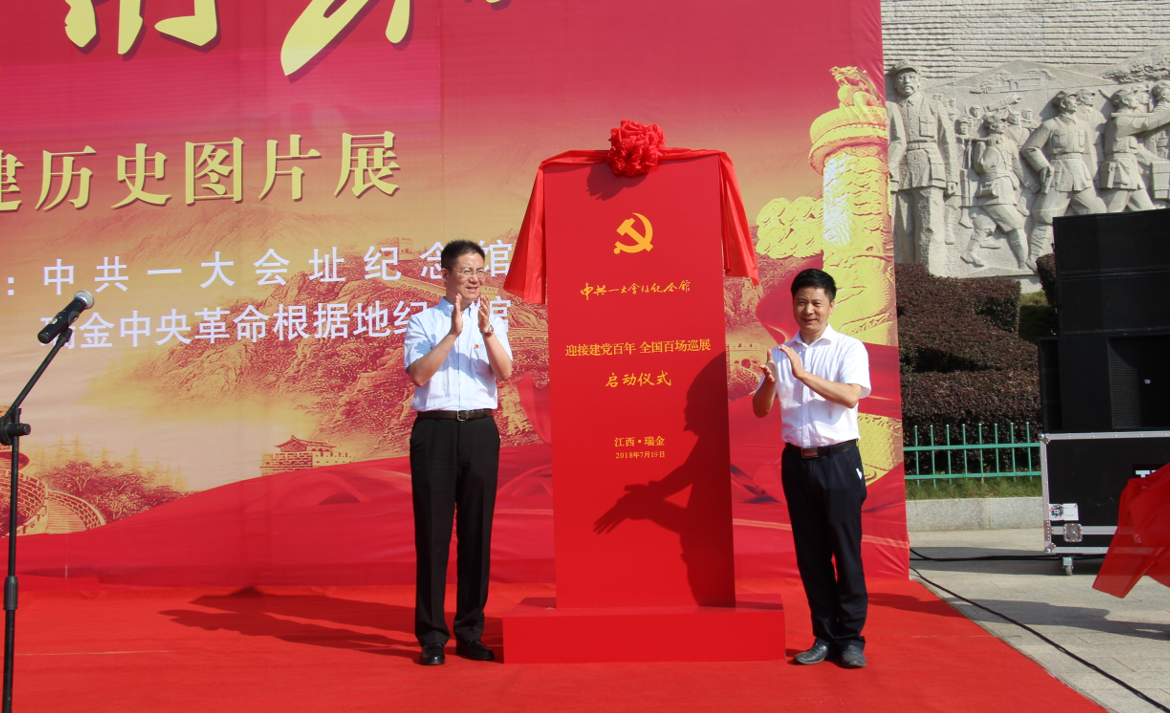 中共一大会址纪念馆副馆长徐明和瑞金中央革命根据地纪念馆馆长周景春一同揭牌,宣布“迎接建党百年 全国百场巡展”正式启动