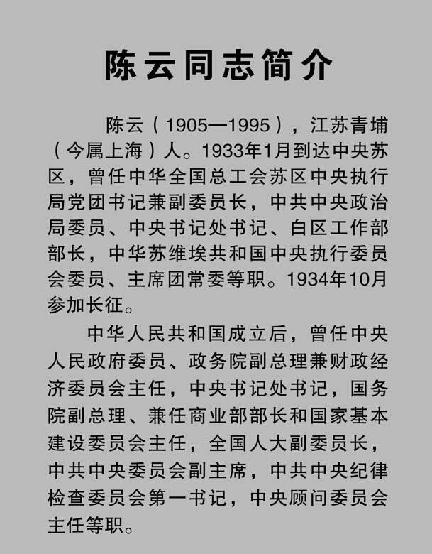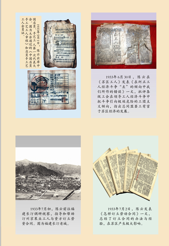 展览简介:陈云从1933年1月至1934年10月,在中央苏区工作战斗了一年零九个月,时任中共中央局成员、常委,全总苏区中央执行局党团书记、副委员长,中共中央白区工作部部长等职。他求真务实,富有卓见,在苏区主要从事经济、工运和白区工作,为苏区经济发展、政权建设和革命战争,作出了重要贡献。在陈云诞辰110周年之际,为缅怀和宣传陈云在中央苏区所建立的历史功绩,我馆于12月1日至12月30日,在本馆三楼临时展厅举办《陈云在中央苏区》展览。展览以陈云担任的职务和所从事的工作为线索,围绕抵制和批判“左”倾劳动政策,领导工人正确开展经济斗争;反对官僚主义,关注群众的切身利益;指导开展白区工作,转变游击区域的斗争方式等方面进行展示,全面回顾了陈云在中央苏区的历程,反映了陈云坚持真理、唯实务实、亲民为民的崇高思想品德和精神风范。